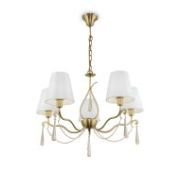 Металлическая арматура. Цвет – латунь. Абажуры из фактурной ткани белого цвета. Декор – хрустальные подвесы каплевидной формы. Одиночный подвес и торшер с цоколем Е27, лампа, бра и люстры – Е14.